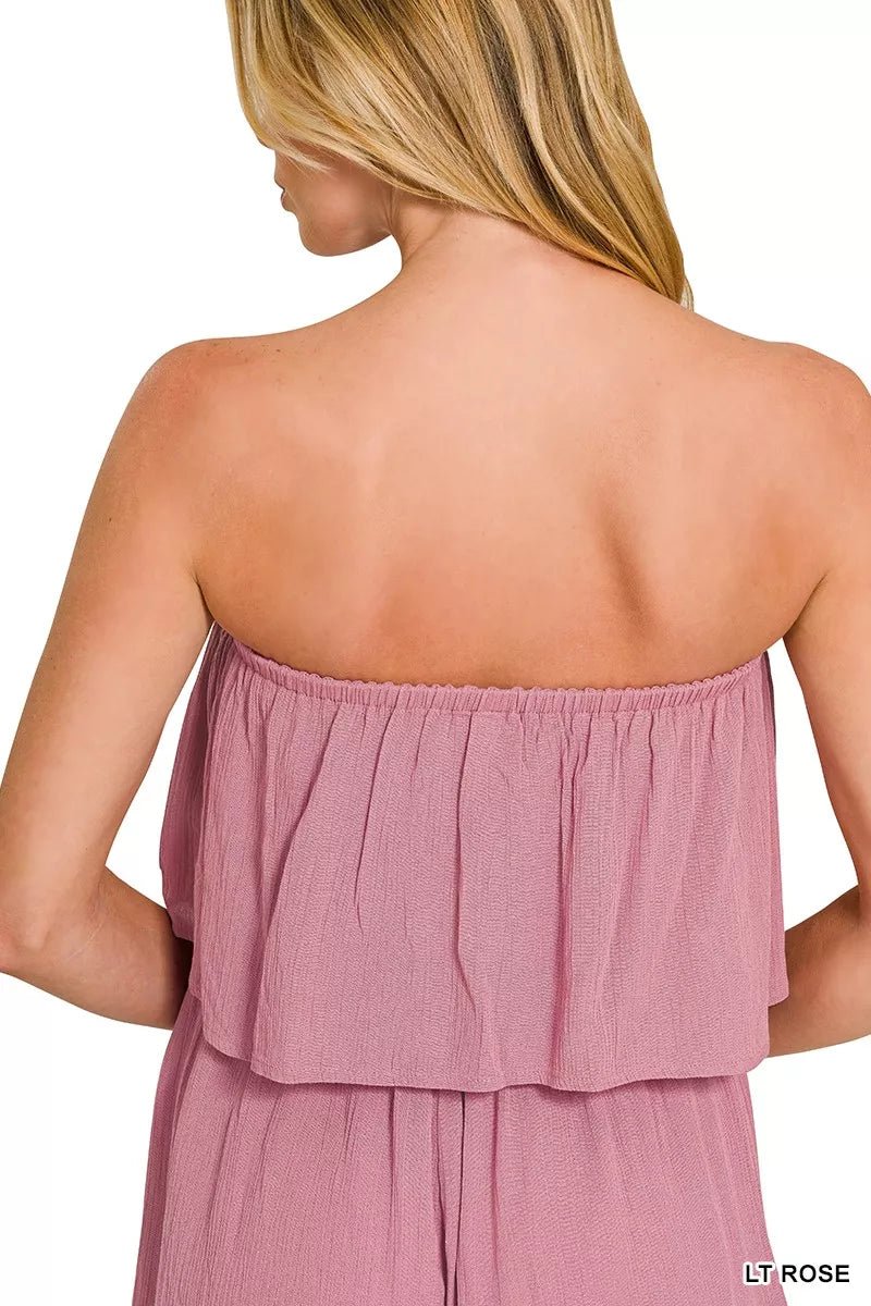 The Woven Crinkle Strapless Romper is your go-to for easy, sun-kissed summer style. Relaxed crinkle fabric, a chic strapless cut, and effortless one-piece comfort—perfect for beach days or casual hangs with friends.