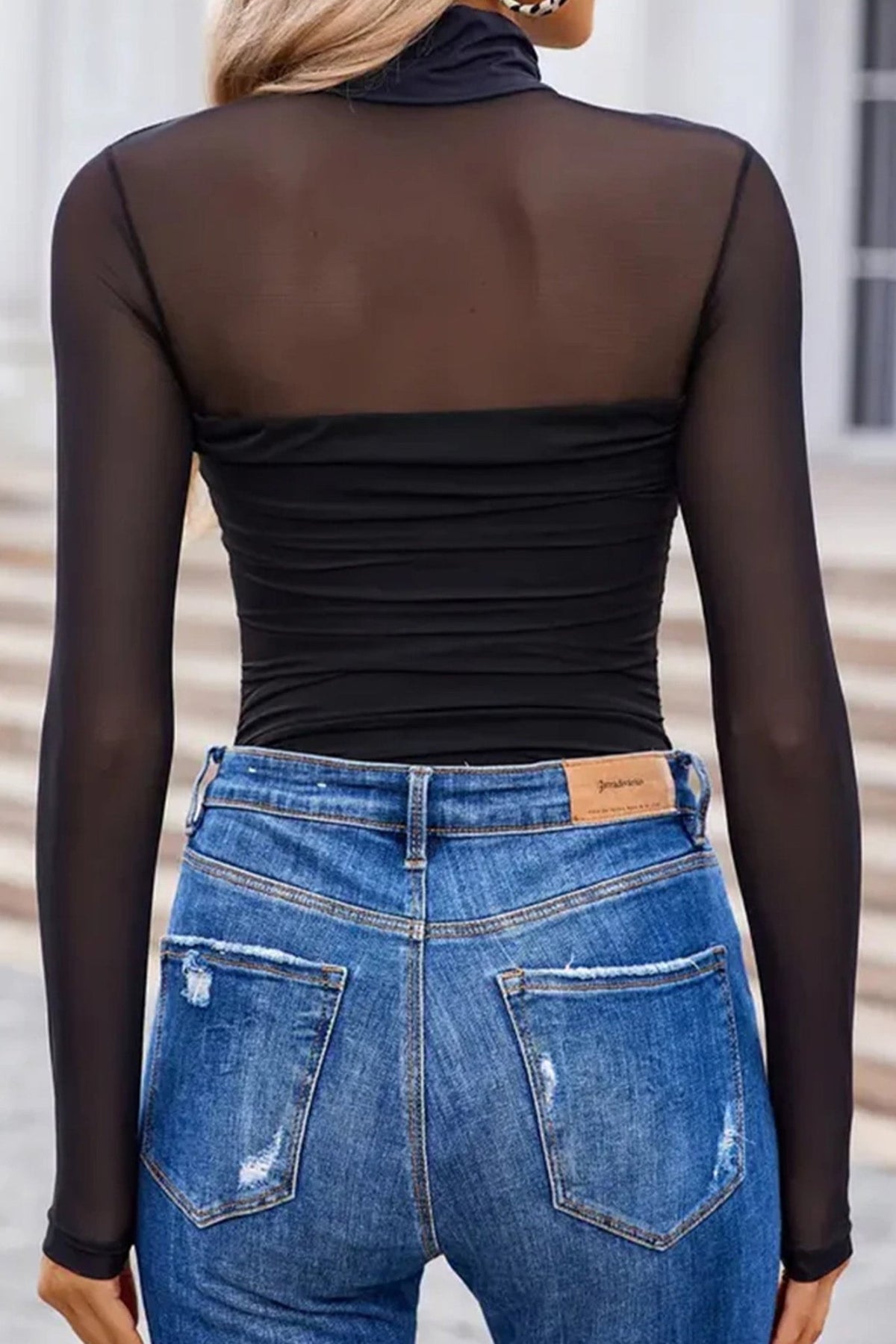 • High neck, long sleeves, sheer mesh patchwork